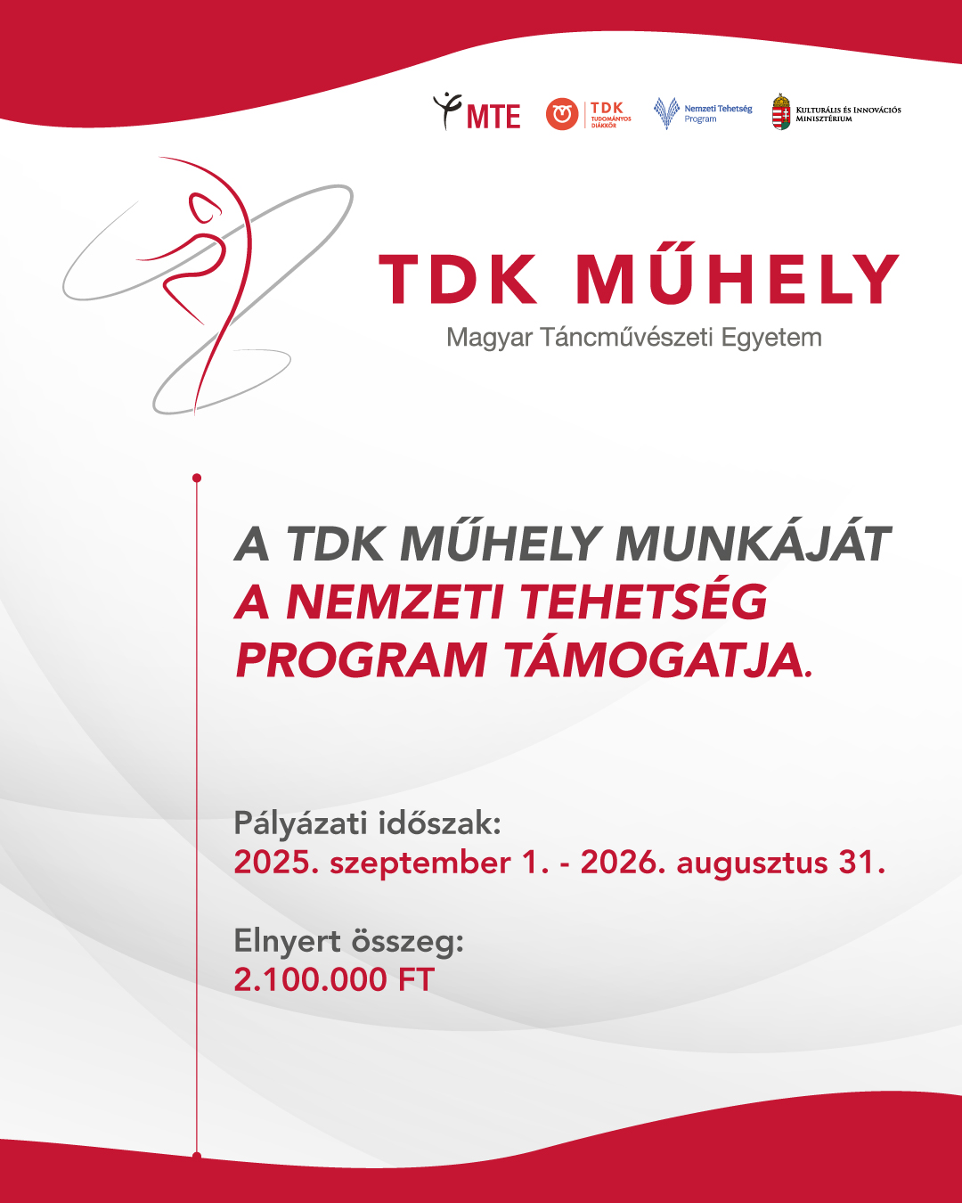 A Magyar Táncművészeti Egyetem elnyerte a Nemzeti Tehetségprogram pályázati támogatását (NTP-HHTDK-25). A pályázat célja az Országos Tudományos Diákköri Konferencián való részvétel, valamint a tudományos műhelyek működésének és lebonyolításának támogatása. Az elnyert összeg 2 100 000 Ft, a megvalósítás időszaka: 2025.09.01 – 2026.08.31.